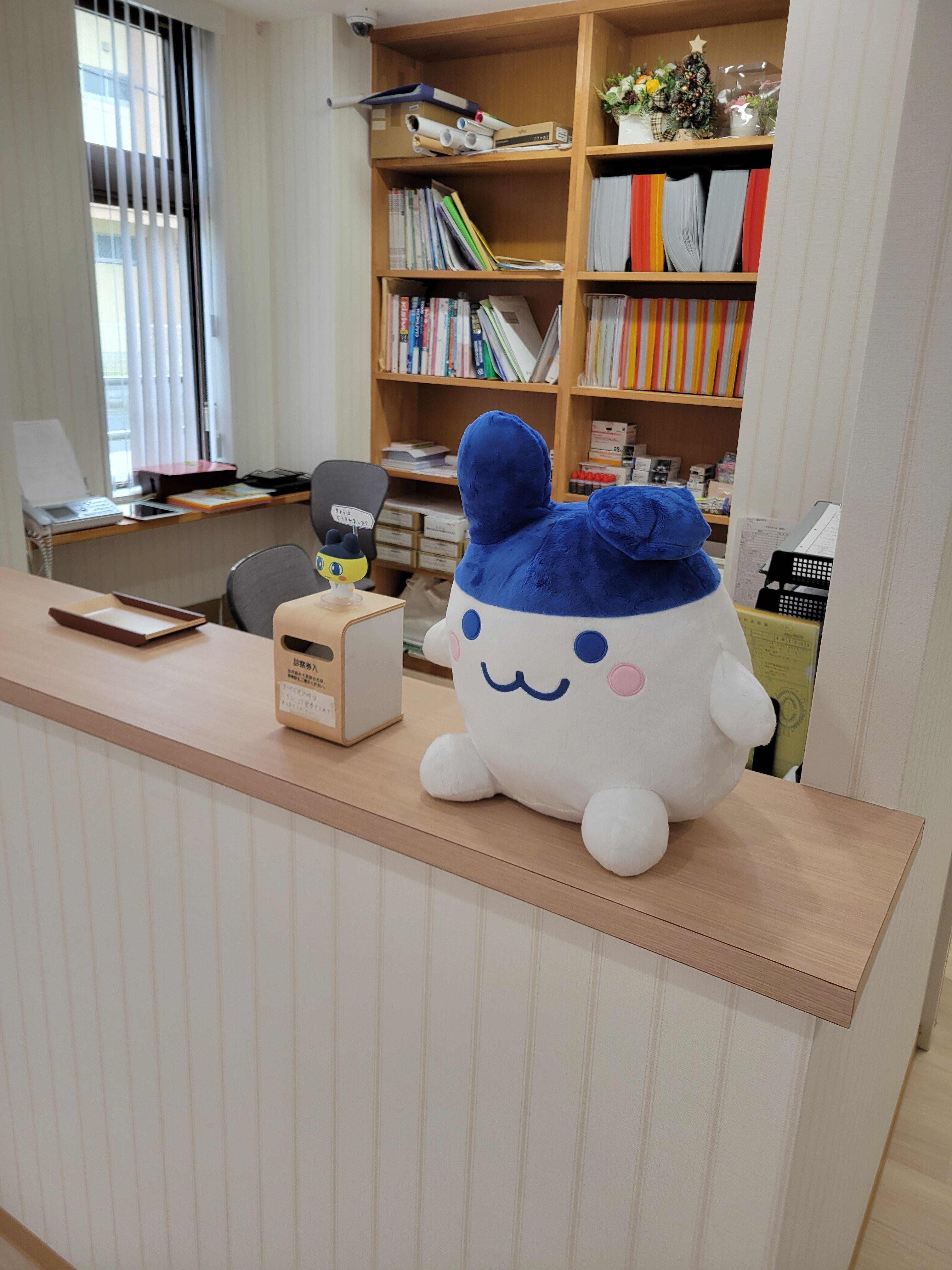 受け付けで皆様を迎えるスタッフが増えました! たまごっちのみみっちのぬいぐるみです! かわいくないですか?!?! これをネットで見て一目惚れしたのですが、一番くじのラストワン賞だったのでなかなか手に入らず。 ですがメルカリで譲っていただき本日到着しました!